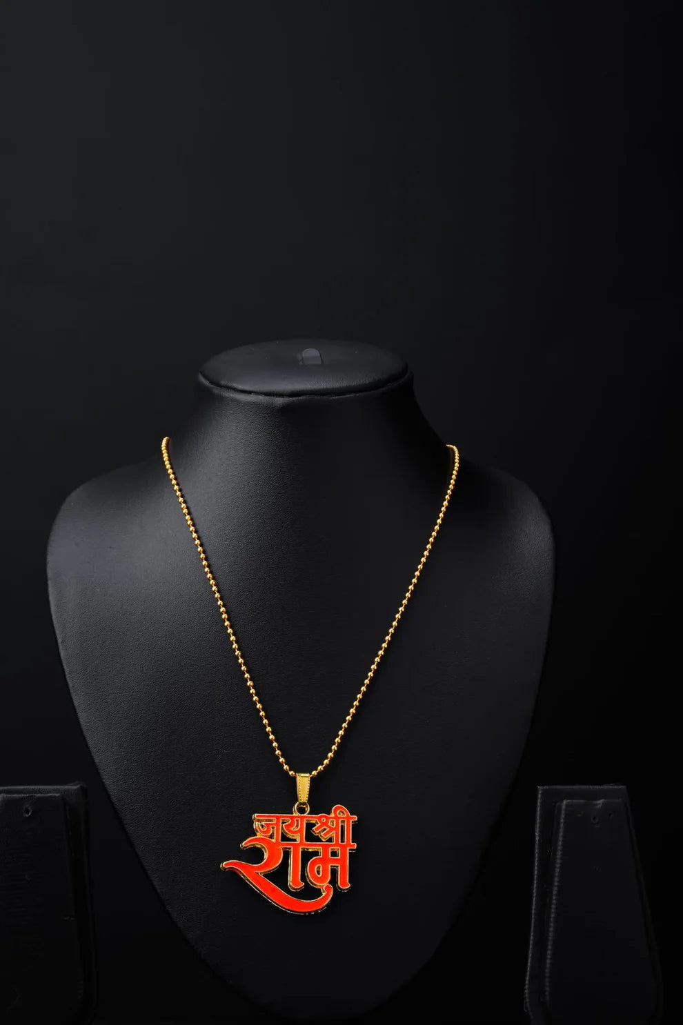 Crafted with rich red meenakari, the pendant features "Jai Shri Ram" in Hindi and comes with a charming gold-plated rope chain. This graceful piece is perfect for both men and women to wear and celebrate the special occasion.